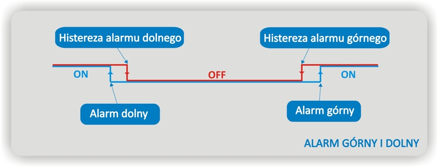 Korzystając z ustawień menu jak poniżej można uruchamiać urządzenia zewnętrzne wyzwalane przekroczeniem któregoś z alarmów (górnego lub dolnego). Sterowanie każdym urządzeniem zewnętrznym wyzwalane alarmem posiada możliwość ustawienia histerezy.