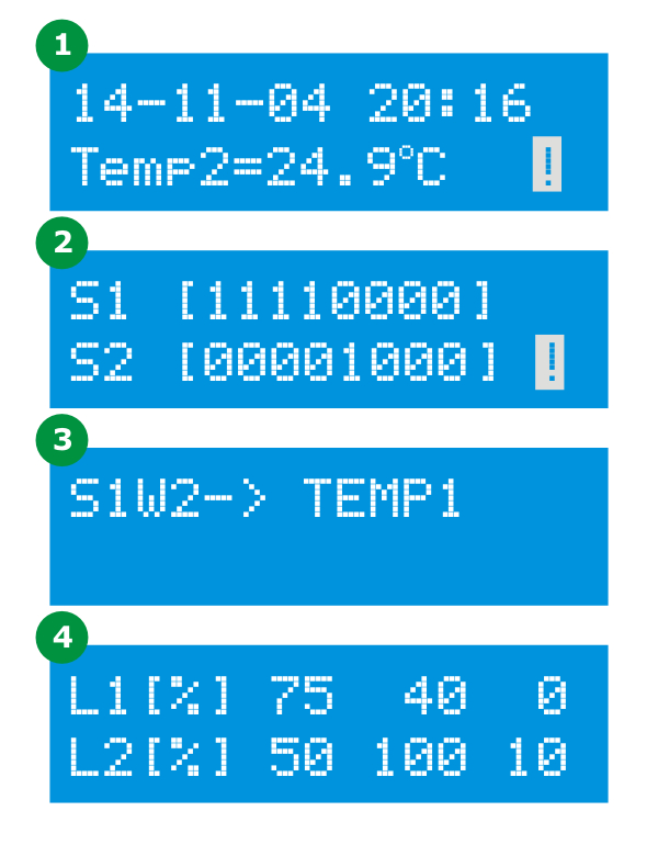 Stan wyjść kontrolerów oświetlenia L1 i L2 (trzykrotne naciśnięcie OK).