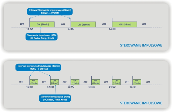 Przykład: Interwał Sterowania Impulsowego jest ustawiony na 30 minut (Menu -> SYSTEM), a sterowanie impulsowe dla temperatury jest ustawione na 40%  (Menu -> Czujniki -> Temp1/Temp2) oznacza że grzałka będzie pracować przez 12 minut w każdej półgodzinie tzn.  między godziną 13:00 a godz. 14:00  będzie włączona od 13:00 do 13:12 oraz od 13:30 do 13:42 itd.  Dla Interwału równego 60 minut i sterowania impulsowego równego 60%, grzałka będzie włączona od 13:00 do 13:36 i tak w każdej godzinie.