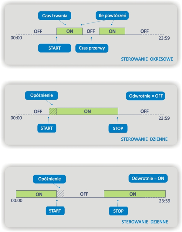 Sterowanie okresowe – umożliwia cykliczne włączanie i wyłączenie urządzeń zewnętrznych z zadanym czasem trwanie (CZAS TRWANIA), zadanym czasem przerwy (CZAS PRZERWY) oraz ilością powtórzeń (ILE POWTÓRZEŃ). Cykliczne działanie urządzenia zewnętrznego odbywa się w okienku czasowym którego początek jest ustawiony parametrem (UST. GODZ START; UST. MIN. STARTU), a długość jest wyznaczona przez parametr (ILE POWTÓRZEŃ).
