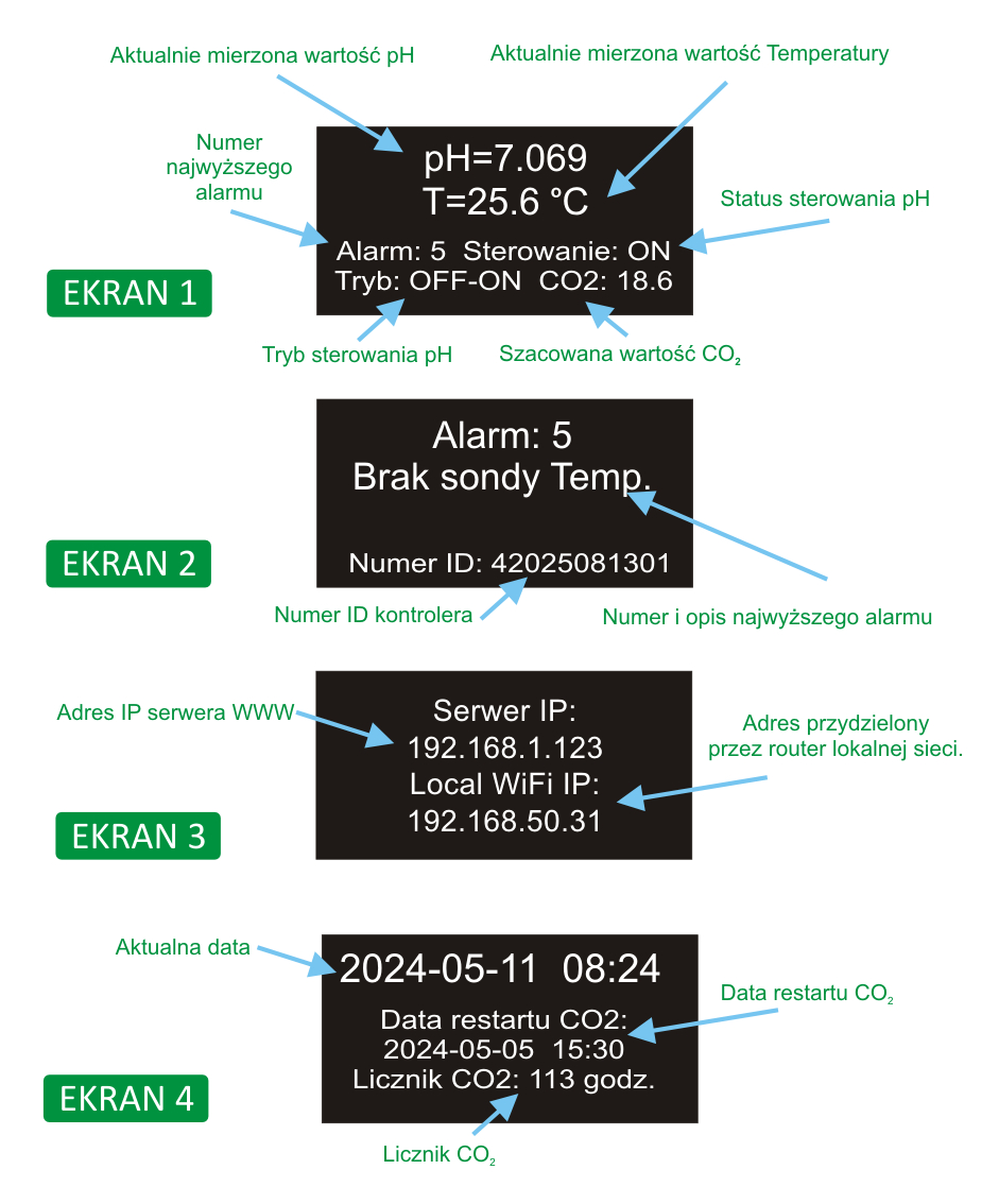 Pomiar pH, alarmy, tryb działania, stan kontrolera (OLED)