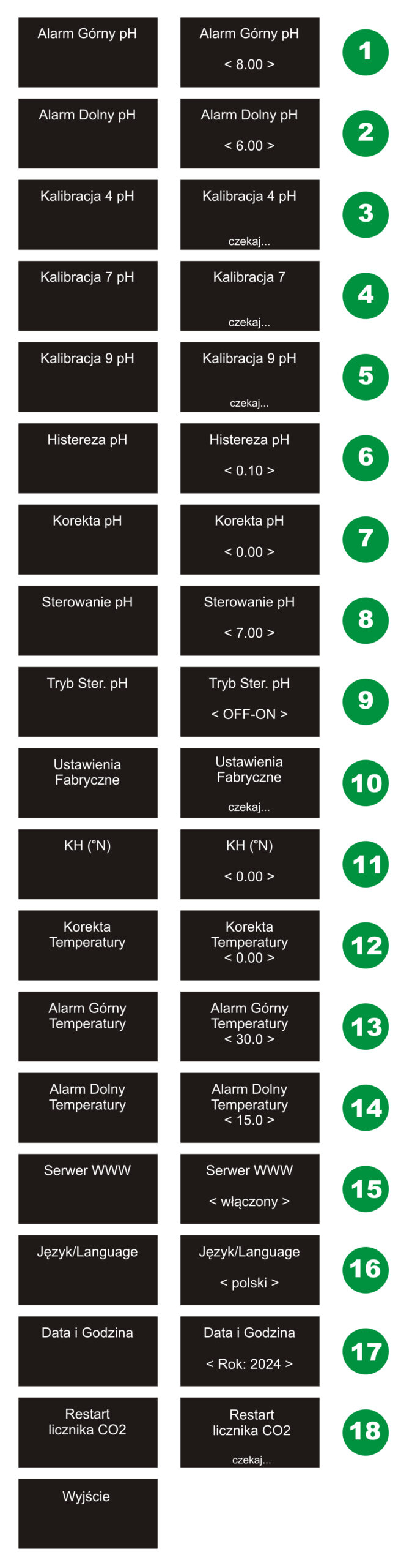 Restart licznika CO2 – restartuje datę i licznik CO2 (wymiana/napełnienie butli CO2)