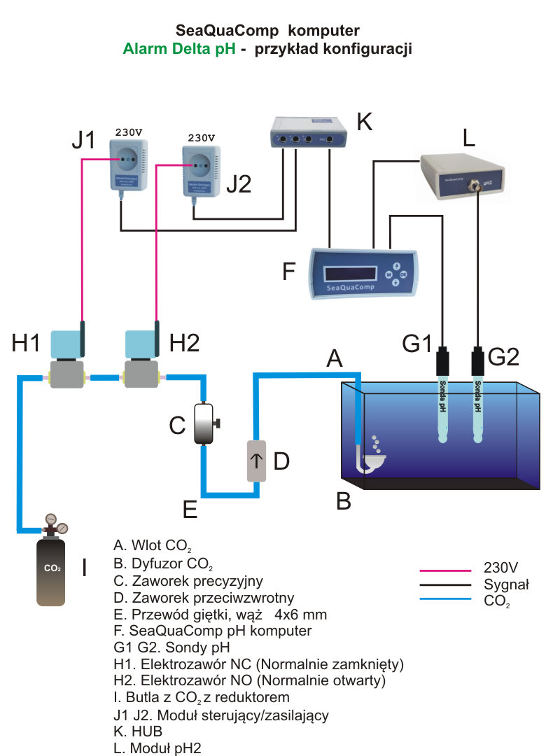 Zewnętrzny muduł pH (pH2) umożliwia dodatkowy pomiar tej wartości w akwarium. W zależności od potrzeby możemy wykorzystać go do zwiększenia niezawodności monitorowania parametru pH a tym samym niezawodności dozowania CO2 czy sterowania Reaktora Wapnia. Zastosowanie modułu pH2 umożliwia włączenie dodatkowej funkcji „Alarm Delta pH”, która odpowiada za połączenie wskazań obu pomiarów pH (pH i pH2) i odpowiedniej reakcji w zależności od otrzymanych wyników. Rozbieżność pomiarów pH wykonanych przez dwie niezależne sondy wskazuje na konieczność sprawdzenia czy sondy działają prawidłowo i są dobrze skalibrowane. Opis tej funkcjonalności znajduje się poniżej.
