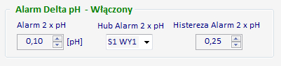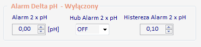 Jeżeli ΔpH jest równa lub większa niż ustawiony parametr „Alarm 2xpH” następuje włączenie alarmu „Delta pH za duża” oraz załączenie wyjścia ustawionego parametrem „Hub Alarm 2xpH”. Jeżeli ΔpH jest mniejsza niż ustawiony parametr „Alarm 2xpH” następuje wyłączenie alarmu, a jeżeli ΔpH jest mniejsza niż ustawiony parametr „Alarm 2xpH” pomniejszony o wartość histerezy („Histereza Alarm 2xpH”) to następuje wyłączenie wyjścia ustawionego parametrem „Hub Alarm 2xpH”.